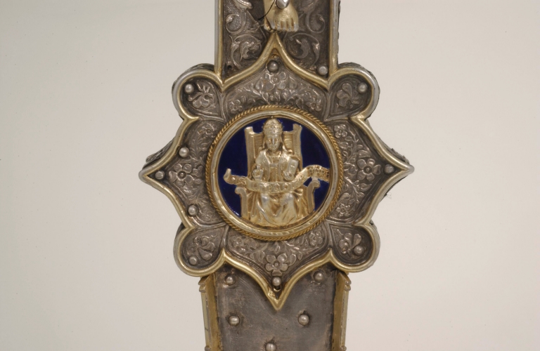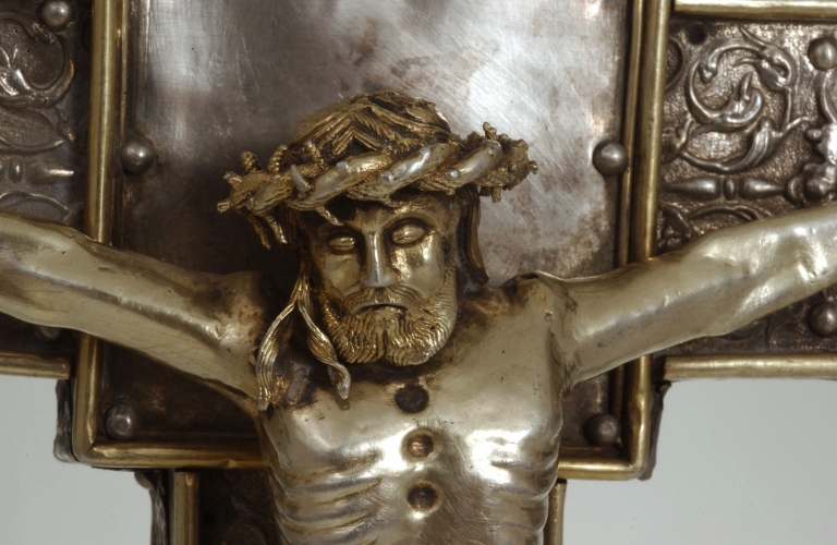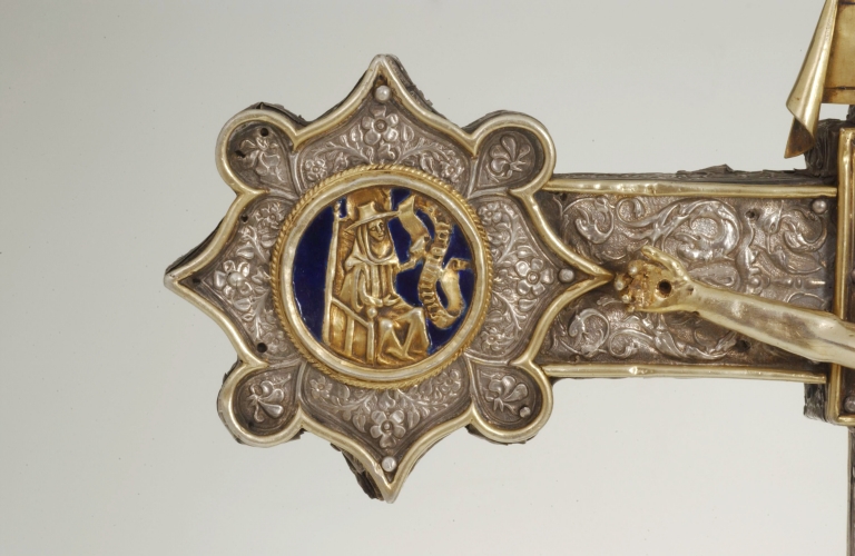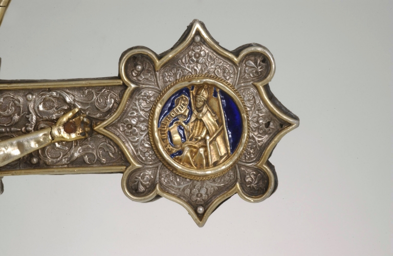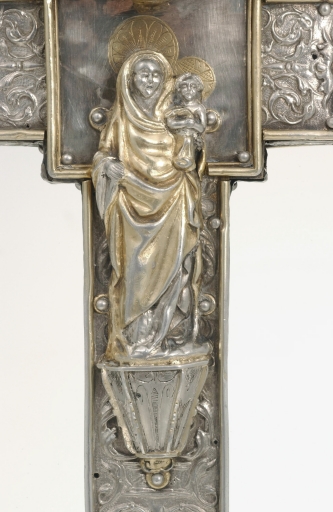 Le traitement stylistique de l´anatomie du Christ, celui des visages assez frustes de la Vierge et de l´Enfant au revers de la croix, le mode de fixation caractéristique à l´aide de pattes latérales sont autant de détails qui rappellent la croix de Saint-Rémy. L´ensemble du décor estampé