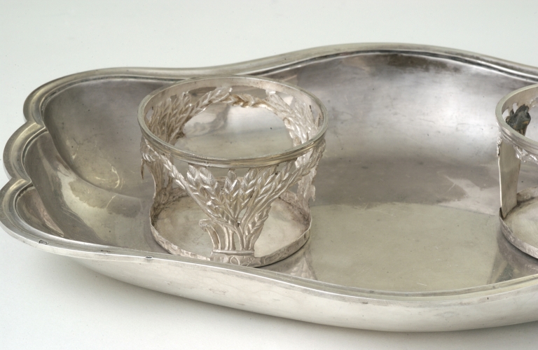 Burettes et plateau réalisées en 1784 par l'orfèvre rennais ambroise Laneau.
