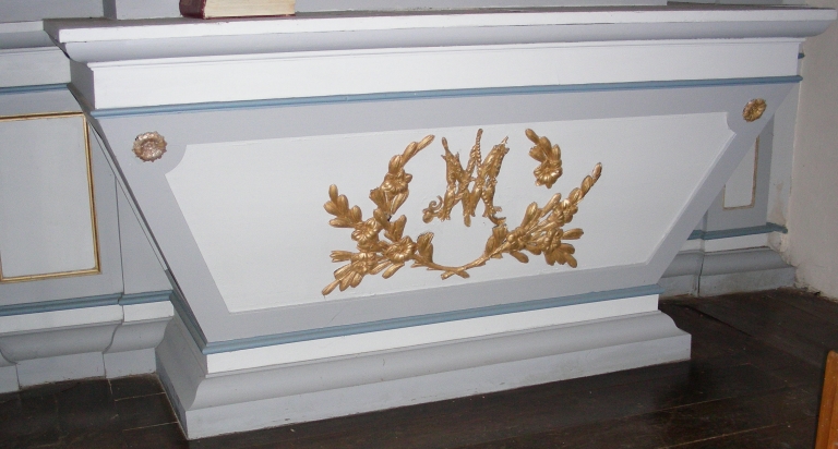 Entablement incurvé formant fronton, palmes et pots à feu ; retable à pilastres encastrés.