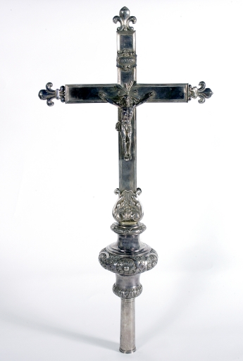Croix de procession, aux bras lisses surlignés d'une bordure moulurée et aux fleurons de fleurs de lys en argent repoussé, a noeud en forme de vase médicis présentant à sa base une alternance de fleurs (marguerite) et de feuilles. Des rayons de faible dimension sont fixés derrière le Christ et au revers de la croix - l'un des rayons est cassé. C'est une solution pour masquer le raccord de la croisée ; Le Christ, fondu et repris en ciselure, est tenu au niveau des bras et des pieds par des pointes fixées par 3 écrous à quatre ailes placés au revers de la croix. Le titulus, pièce fondue, est de style rocaille.