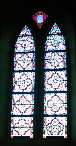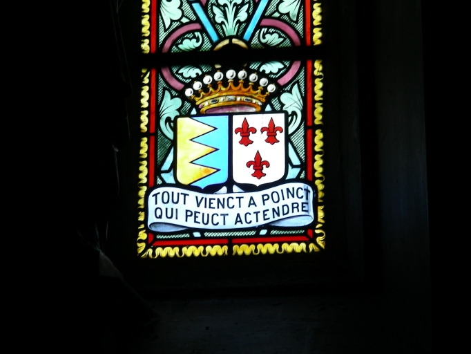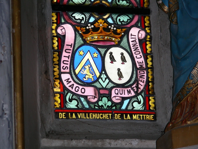 Baie 4 : armoiries de la famille de La Ville Huchet de la Mettrie ; Baie 8 : armoiries des familles LAUBESPIN, BERNIS, LA MOUSSAYE ; Baie 9 : Tour ; Baie 14 : armoiries ; Baie 10 : Etoile ; Baie 11 : clé ; Baie 12 : Arche d'alliance.