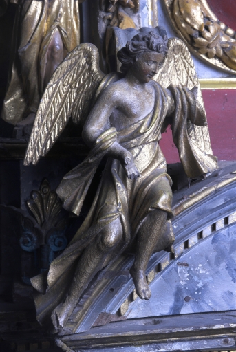 Plusieurs manques : bras des angelots. Trous d'envol, écailles de polychromie, trous de pointes. Mériterait une restauration.