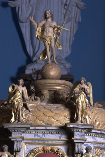 Autel en bois peint faux-marbre avec représentation de l'agneau sur le devant d'autel. Retable composé d'un tabernacle à ailes composé de niches décorées de coquille stylisées, de panneaux à représentation végétale et de colonnettes à chapiteaux corinthiens. Une corniche et des balustres séparent le premier niveau du second. Des angelots, à la sculpture délicate, surmontent le tabernacle. Un Christ Sauveur est posé sur le dôme.