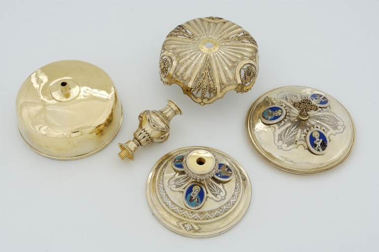 Les médaillons insérés par vis sur le pied et le couvercle : saint Pierre, saint Evêque et le Sacré-coeur..