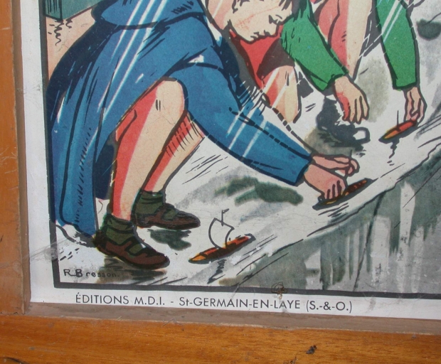 Signature dans l'angle inférieur droit : R. Bresson. Marque d'éditeur imprimée dans un angle inférieur, sous le trait d'encadrement : EDITIONS MDI - St-GERMAIN-EN-LAYE (S.-&-O.) ; M. D. I. signifie : Maison des Instituteurs. Logo : M / DI dans un angle inférieur, à l'intérieur de l'encadrement. Marque d'imprimeur dans un angle inférieur : IMPRIMERIES OBERTHUR ou IMP. LIEVIN DANIEL, LILLE.