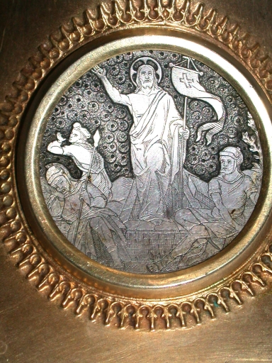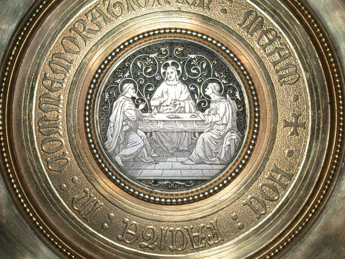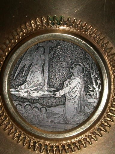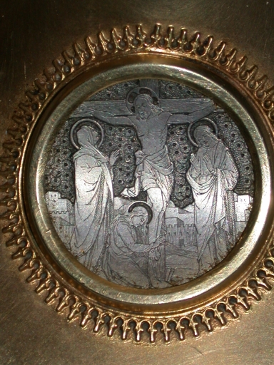 Sur la patène : les Pèlerins d'Emmaüs ; sur le pied du calice : Jardin des oliviers, Calvaire avec sainte Marie-Madeleine, Résurrection du Christ ; sur la fausse coupe : Couronnement de la Vierge, Vierge dans une mandorle portée par deux anges, Jésus marchant sur les eaux avec saint Pierre.