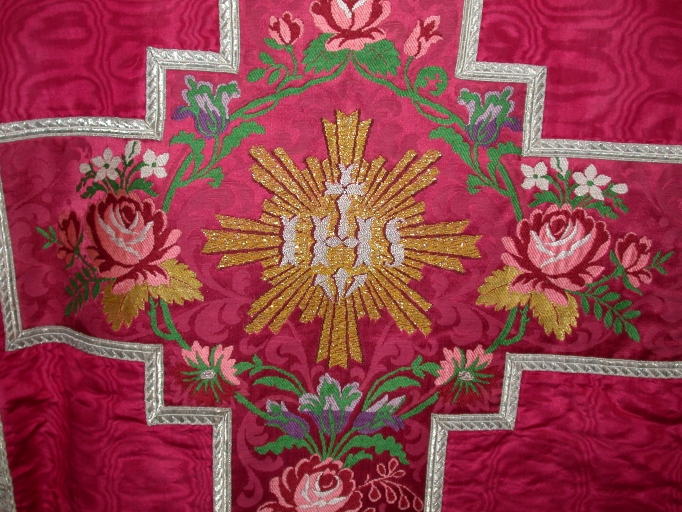 Sur la chasuble : I.H.S. rayonnant, représentation végétale, croix.