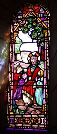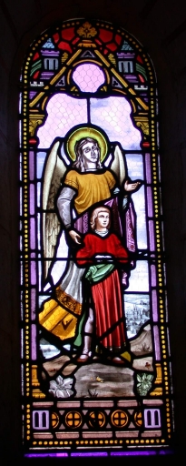 Verrières à personnages des baies 1 à 3, 5, 7 : Communion de la Vierge, Apparition du Sacré Coeur, Jésus et les enfants, Baptême du Christ, Ange gardien et verrières décoratives des baies 101 et 102,