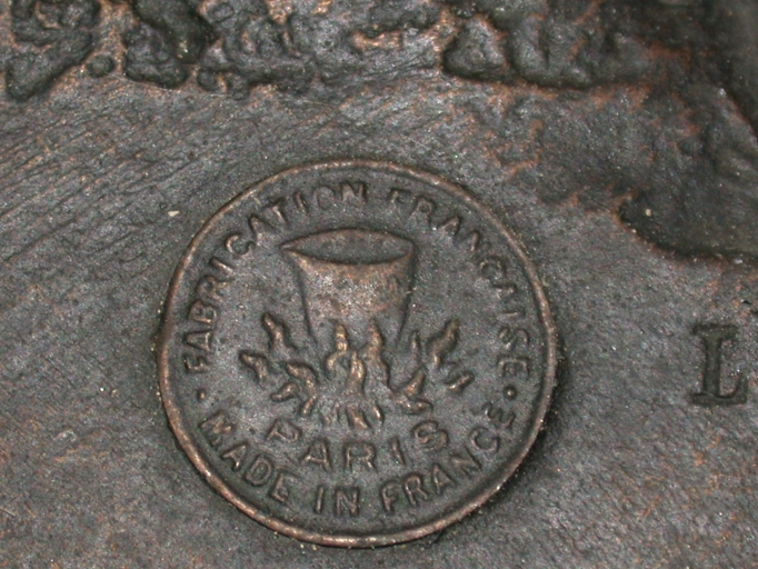 Marque en creux à l'arrière sur la plinthe : FABRICATION FRANCAISE / PARIS / MADE IN FRANCE. Lettre en creux : L.