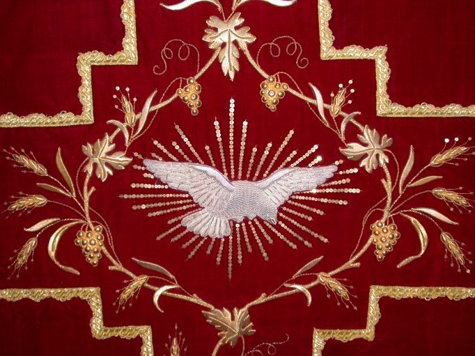 Sur la chasuble : Colombe du Saint-Esprit rayonnante, rinceaux de vigne et de blé.