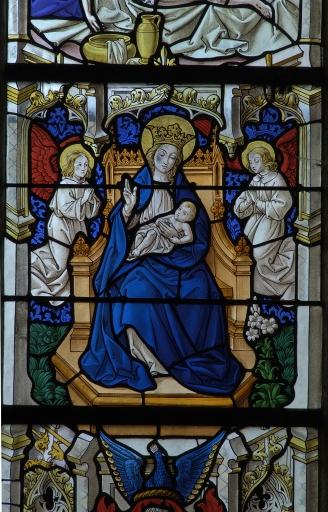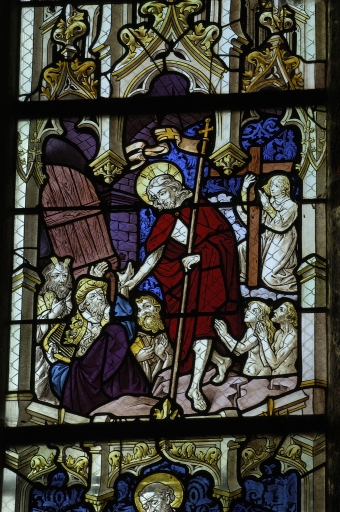 Quelques éléments de la verrière primitive - essentiellement des personnages du Jugement dernier - ont été remontés en 1924 dans la baie qui l'accueillait précédemment, elle-même reconstruite dans l'angle sud-ouest de la nouvelle église. Ce remontage est l'oeuvre du verrier chartrain Charles Lorin qui complète la verrière en reproduisant les scènes dans un style néo-gothique sur fonds de damas inspirés de ceux des verrières de la cathédrale de Bourges. Les armoiries semblent avoir été rendues avec quelques erreurs (erreurs dans les émaux, inversions entre les lancettes gauche et centrale). Les panneaux anciens ont été déposés entre 1957 et la fin des années 1970 et remontés par l´atelier du verrier Sainte Marie.