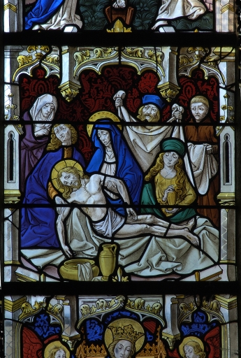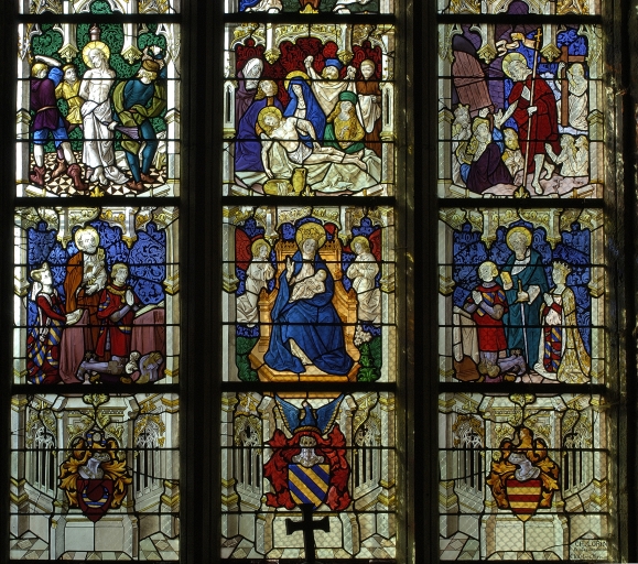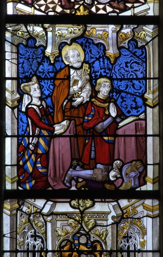 La maîtresse-vitre, mise en place pendant le 1er quart du 15e siècle, était consacrée à la Passion du Christ et à sa Résurrection (lancettes) ainsi qu´au Jugement dernier (tympan). Elle est connue par une description qu´en fit l´abbé Guillotin de Corson d´après un dessin de 1769 réalisé à l´occasion d´une restauration. Le registre inférieur était occupé par une Vierge à l´Enfant en majesté encadrée de deux couples de donateurs, seigneurs et dames de Saint-Père et de Tréal, présentés l´un par saint Pierre (à gauche), l´autre par saint Paul (à droite). Le registre central était consacré à la Passion du Christ : Flagellation, Mise au tombeau et Descente aux limbes. Au registre supérieur étaient représentés : au centre, un Calvaire ; à gauche, les armoiries de la famille de Tréal ayant pour cimier un croissant burelé ; à droite, les armoiries - fascé d´argent et de gueules - d´une famille non identifiée. On peut imaginer avec vraisemblance que le Calvaire était primitivement encadré de deux scènes de la Passion, remplacées ensuite par les armoiries. Au tympan, "étaient retracées les grandes scènes de la Résurrection des morts et du Jugement général. Au sommet était le blason des sires de Béringhen, marquis de Châteauneuf : d´argent à trois pals de gueules, au chef d´azur chargé de deux quintefeuilles d´argent". "Le reste du vitrail, " nous dit Guillotin de Corson en 1886, "représentant différents saints, est moderne."