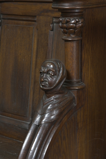 Les quatre stalles principales, les plus ornées, ont été déposées contre le mur ouest de la chapelle sud ; le lambris qui les surmontait a été laissé en place à l'entrée du choeur, au niveau des pupitres ; leur dais a disparu.