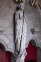 Le portail comporte une porte à pilier central - déterminant deux baies géminées trilobées - et un tympan en arc brisé orné d'une statue sous dais, elle-même encadrée de deux autres statues.