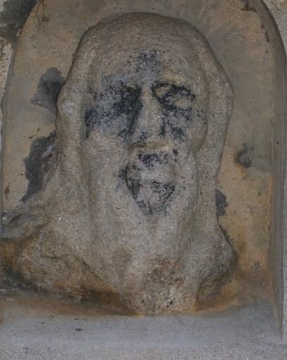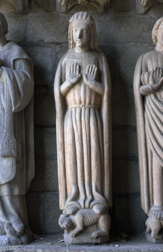 Chaque statue est placée sous un dais et repose sur un animal. Des attributs en enduit peint ont été maladroitement ajoutés à deux statues de droite : un médaillon portant un agneau rappelant saint Jean-Baptiste sur une statue de saint diacre, peut-être saint Laurent ; un livre sur une statue de saint non identifié. Traces de polychromie sur la tête.