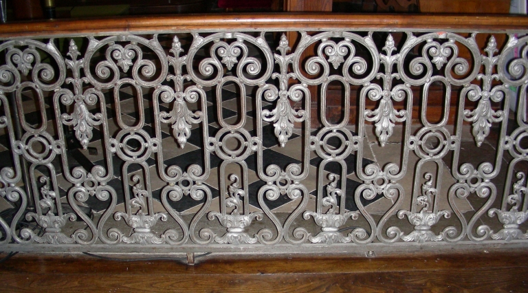 Belle clôture de choeur alliant motifs géométriques et représentation végétale. De plus, elle demeure dans son intégrité et présente une incursivité devant les retables latéraux.