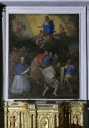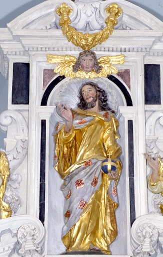 Maître-autel comportant trois corps. La partie centrale forme avant-corps avec corniche cintrée interrompue pour donner naissance au motif de couronnement qui se compose d'une niche surmontée d'une croix. Des personnages assis accompagnent la niche. Les parties latérales comprenant une niche au-dessus d'une porte, sont surmontées d'un motif à cartouche. Les colonnes d'ordre corinthien sont en marbre.