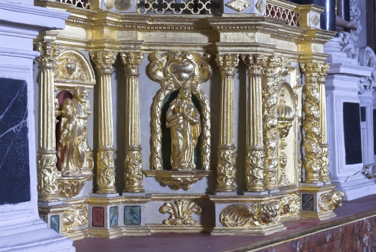 Tabernacle à ailes, à colonnes cannelées et torsadées et à chapiteaux corinthiens. 4 statuettes dorées sont placées dans des niches aux tympans plein cintre. Des angelots, des guirlandes de feuilles, des parchemins viennent ornementer une composition fortement structurée par un entablement, une corniche et une balustrade ouvragée de quadrilobes ajourés, le tout surmonté par une structure qui, probablement recevait le dais d'exposition conservée dans le choeur de l'église.