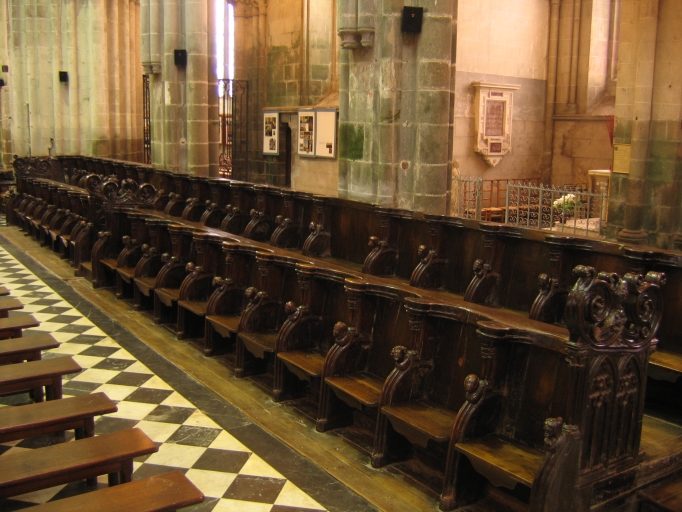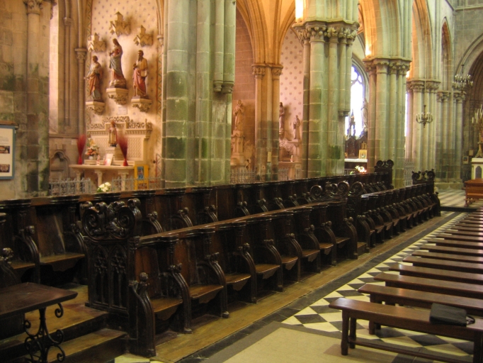 Les stalles conservées dans la cathédrale Saint-Samson de Dol-de-Bretagne sont les plus anciennes du corpus étudié. Les soixante-dix-sept sièges de Dol composent l´ensemble le plus important de Bretagne. Réalisées en chêne foncé, ces stalles sont généralement datées du 14e siècle. Néanmoins, aucun document ne vient confirmer cette hypothèse. Elles présentent également la particularité d´avoir conservé leurs stalles en retour. La cathèdre qui vient terminer les rangs sud n´a pas été réalisée à la même époque, mais au 16e siècle pour l´évêque François de Laval, dont elle porte les armes, tenues par des lions sur le devant du siège.