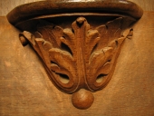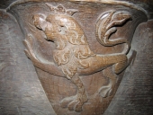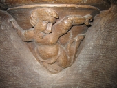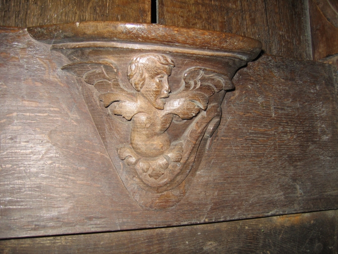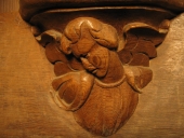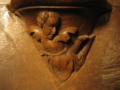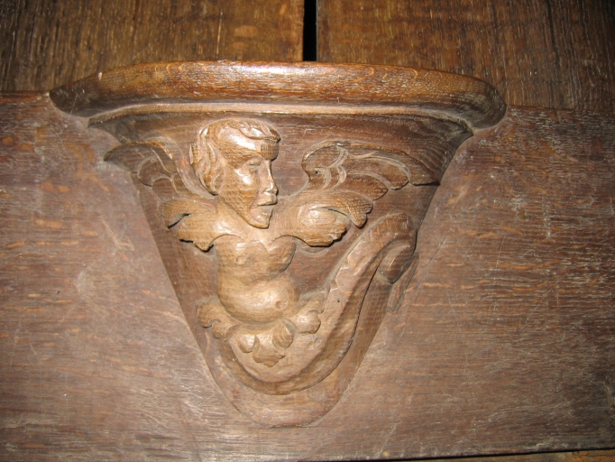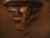 Sur la miséricorde : personnage hybride : buste d´homme dont les bras ont été remplacés par des ailes. Il regarde vers la droite, ses cheveux sont courts et sa bouche est ouverte. Le bas de son corps émerge d´une sorte de corne enroulée à son extrémité et la jointure avec le bas-ventre est réalisée par le biais de feuilles.