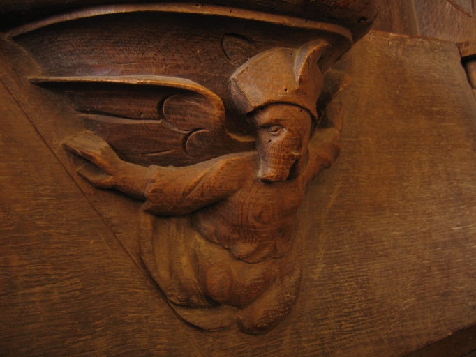 Sur la miséricorde : porc anthropomorphe vêtu d´une tunique longue ceinturée et doté d´ailes. Il porte un bonnet duquel dépassent ses oreilles. Son corps est vu de face mais sa tête est tourné vers la gauche et baissée. Il semble sourire. Ses bras sont écartés donnent l´impression que le personnage vole ou danse. Le groin et les dents sont réalisés de manière naturaliste.