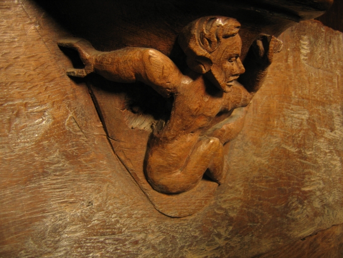 Sur la miséricorde : personnage masculin (?) assis, la jambe droite repliée vers le buste. Le haut du corps est vu de face mais le visage de profil. Les cheveux sont courts et ondulés et il a la bouche entrouverte. Son bras gauche est levé et sa main fermé sur un cimeterre gravé dans le bois de la miséricorde. Son bras droit est rejeté en arrière et il semble se saisir de quelque chose.