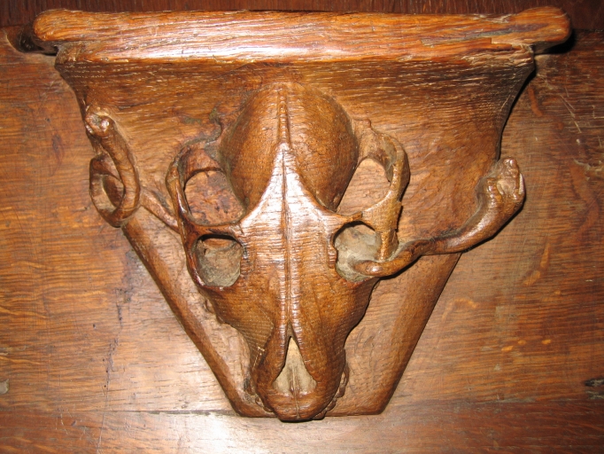 - chêne, mouluré, décor dans la masse, décor à fond en cuvette, décor en bas-relief, décor en demi-relief, décor en haut-relief, ajouré, tourné, vernis, ciré