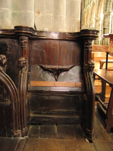 Sur la miséricorde : trois feuilles à nervure centrale sont disposées en triangle de sorte qu'elles sont reliées par leur base.