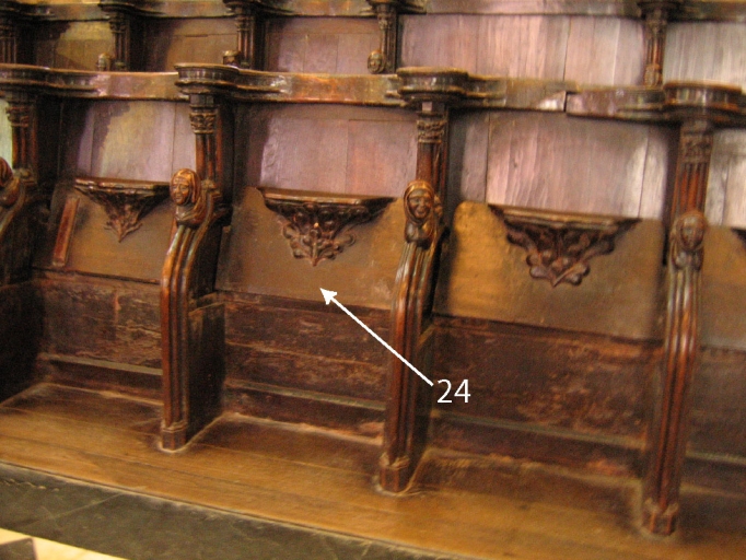 Sur la miséricorde : plusieurs feuilles à bords arrondis s'étalent sur toute la surface de la miséricorde. Elles sont réunies entre elles par leurs tiges.