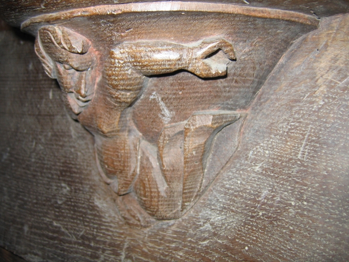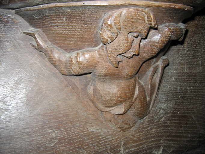 Sur la miséricorde : femme dont le corps est contorsionné, extrêmement cambré. Elle est vêtue d´une tunique longue, ses bras sont rejetés vers l´arrière. Elle ouvre grand la bouche, les commissures vers le bas et fronce des sourcils. Elle est en train de crier.