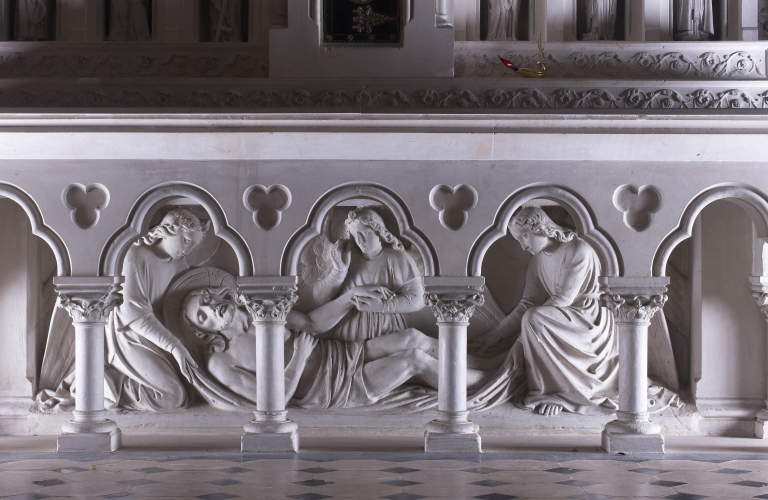 Maître-autel en calcaire avec tabernacle orné de statuettes des apôtres, d'une porte en laiton avec l'agneau mystique représenté. L'autel reçoit un bas relief représentant la Mise au tombeau du Christ. L'emmarchement est un pavement en terre cuite et en marbre.