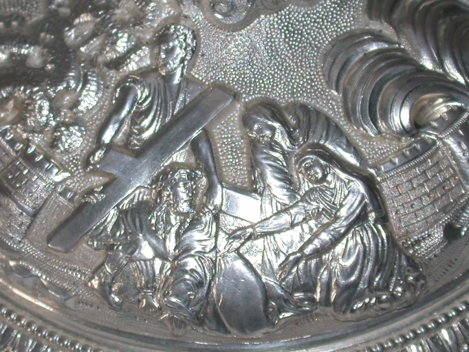 Sur le pied : scènes du Lavement des pieds, du Jardin des oliviers, de la Montée au Calvaire sur fond de murailles de ville, et entrecoupées d'un arbre ; angelots, dans la partie inférieure du pied ; sur la fausse coupe : les vertus théologales dans des médaillons ; sur le couvercle : Christ, Vierge et saint Jean dans des médaillons. Blé, vigne et roseau sur le noeud ainsi qu'entre les médaillons de la fausse coupe et du couvercle.