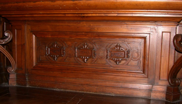 Inscription gravée sur l'autel, sur trois cartouches : FIDES / SPES / CARITAS.