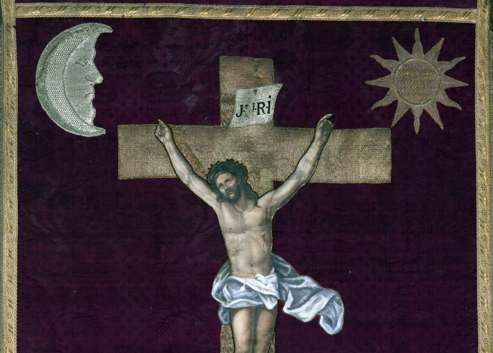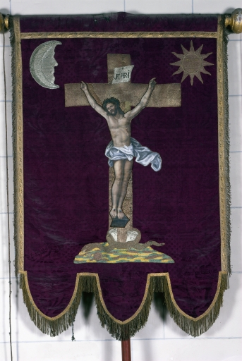 Bannière de procession paroissiale : Saint Martin de Tours, Christ en croix,