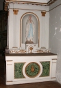 Devant d'autel : coeur enflammé et croix ; porte du tabernacle : ciboire ; deux pilastres de chaque côté de la niche à statue.