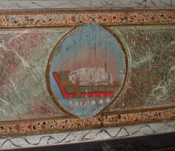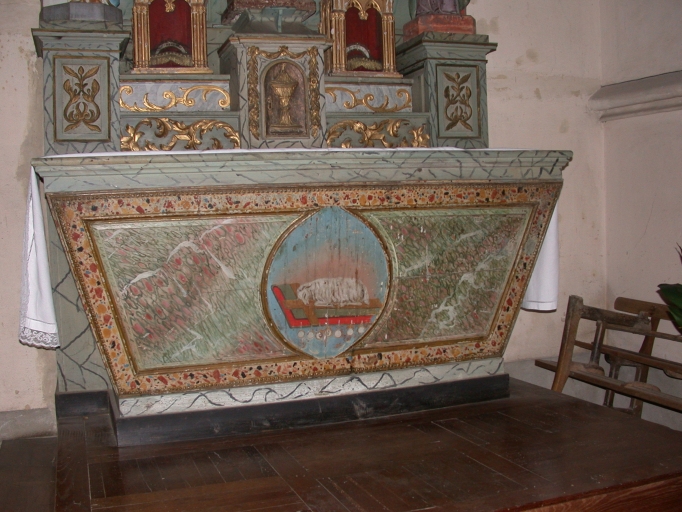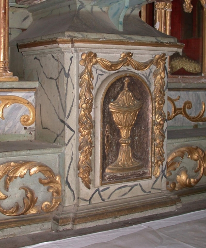L'ensemble a été fabriqué au début du 19e siècle en remployant des éléments de décoration du 18e siècle : porte du tabernacle, rinceaux des gradins.