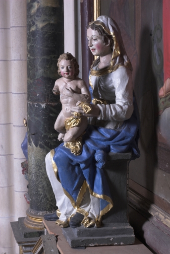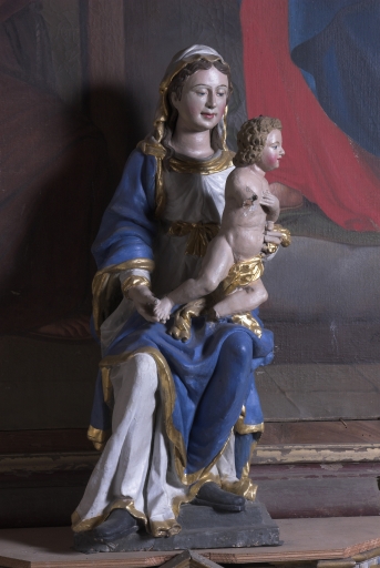 Vierge à l'Enfant assise, portant l'Enfant debout sur sa jambe gauche.