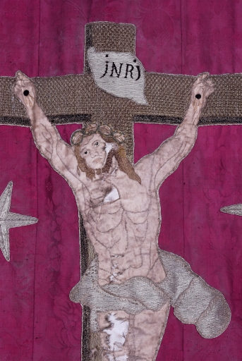 Bannière de procession paroissiale : Saint Erblon ou Herbland de Nantes, Christ en croix,