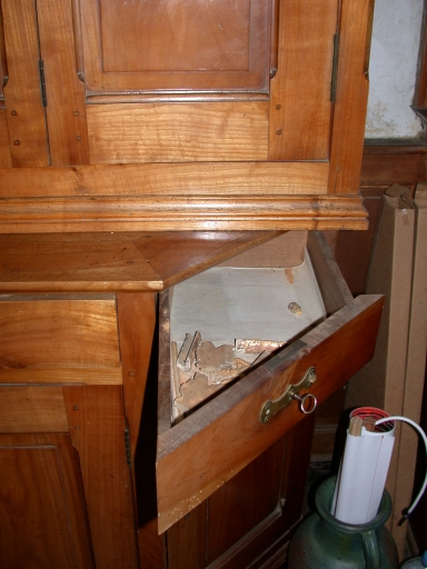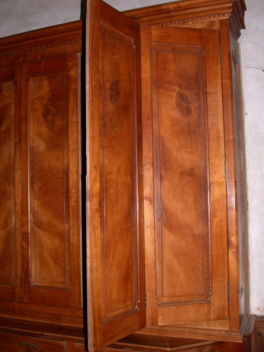 Armoire composée de deux corps. Le corps inférieur à angles abattus comporte quatre battants juxtaposés surmontés de quatre tiroirs de ceinture ; les deux battants latéraux ouvrent sur des volumes ayant un plan de trapèze rectangle, de même que les tiroirs qui les surmontent ; les battants centraux ouvrent sur deux volumes à destination distinctes mais non connues : celui de droite comporte des étagères ; celui de gauche n'est pas divisé ; le battant qui le ferme inclut la plinthe. Le corps supérieur, qui n'occuppait à l'origine que la partie arrière du plateau du corps inférieur, ne comporte que deux battants, divisés chacun en deux parties reliées par des charnières. Corniche à denticule. Le meuble est chevillé.