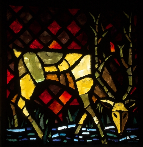 Dans la verrière centrale, source jaillissante dont l'eau traverse les verrières latérales comme une rivière. De chaque côté de la source, chacun dans un panneau, deux cerfs s'abreuvent.