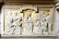 - calcaire, taillé, décor en bas relief, peint, peint à la poudre d'or, faux marbre