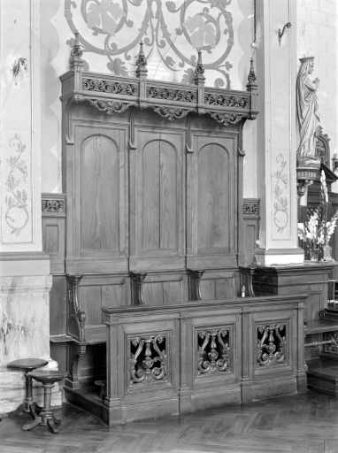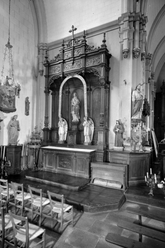 Ensemble de mobilier : maître-autel et son retable, autel-retable de la Vierge, autel-retable de saint Joseph, 3 stalles, chaire à prêcher, confessionnal (Noyal-sous-Bazouges),