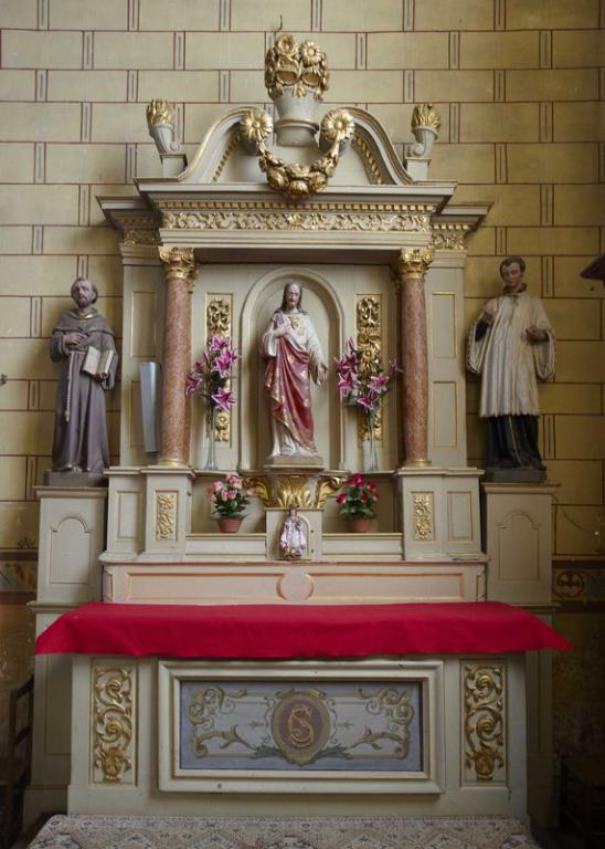 Autel de plan rectangulaire à élévation droite, posé sur un emmarchement ; retable à contretable occupée par une niche en cul-de-four, encadrée de deux colonnes ; entablement et fronton à deux volutes opposées reliées par une guirlande.