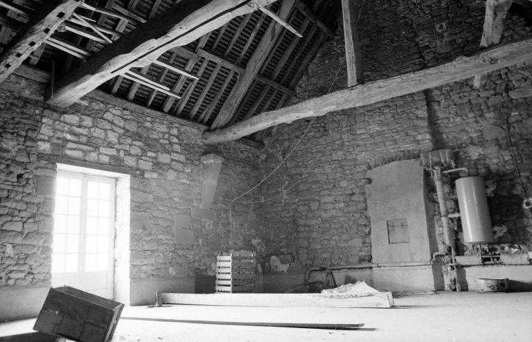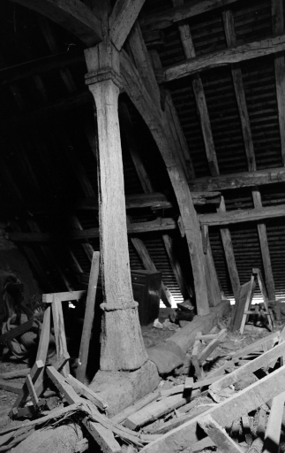 Au moins deux fermes de type armoricain sont encore visibles. Elles comportent un poinçon long décoré d’une double bague renflée carrée. Les très longues contrefiches de faitage et les aisseliers s’assemblent au même niveau sur le poinçon qui est plus épais à cet endroit. Une seule bague renflée équipe la partie basse du poinçon. Les aisseliers sont issus de bois tors, ils s’assemblent aux arbalétriers par systèmes de tenon-mortaise et sont chevillés en trois endroits. Les jambes de force forment avec les aisseliers et les arbalétriers un arc de cercle sans interruption.Les arbalétriers supportent deux paires de pannes dont certaines soutenues par des échantignoles. Il s’agit vraisemblablement d’un aménagement secondaire.