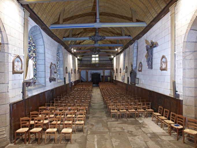 La charpente autrefois apparente est aujourd'hui partiellement cachée par une voûte lambrissée.
