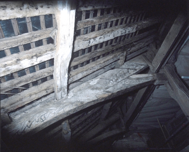 La charpente longtemps cachée par un lambris est pourtant un élément majeur du bâtiment de par ses motifs peints. Il est possible qu’ils soient contemporains de la mise en place de la charpente. De tels soins montrent une fois de plus que la charpente devait être à l’origine visible depuis le bas. Les fermes sont équipées uniquement de poinçons cours où viennent s’assembler faux-entraits et aisseliers. Ces derniers s’assemblent au faux-entrait par tenon-mortaise sans système d’embrèvement. Les deux aisseliers sont de cette manière en contact, cet aspect rare pour les charpentes armoricaines se retrouve dans les charpentes de granges du sud de l’Angleterre du milieu du XIIIe siècle. Les arbalétriers ont la particularité de supporter 3 pannes ventrières ce qui est peu fréquent. Les pannes s’insèrent comme habituellement dans des encoches sur le chant externes des arbalétriers mais il est intéressant de signaler que l’encoche la plus haute sur au moins deux fermes est fortement prolongée. Cela s’explique par le fait qu’elle doit laisser passer deux pannes agencées l’une sur l’autre. Des trous d’échelons sont aussi visibles sur les arbalétriers. Les contrefiches de faitage sont réalisées à partir de bois tors. Des « fermes » secondaires ainsi qu’un sous-faitage ont été aménagés a postériori afin d’y installer la voute lambrissée.