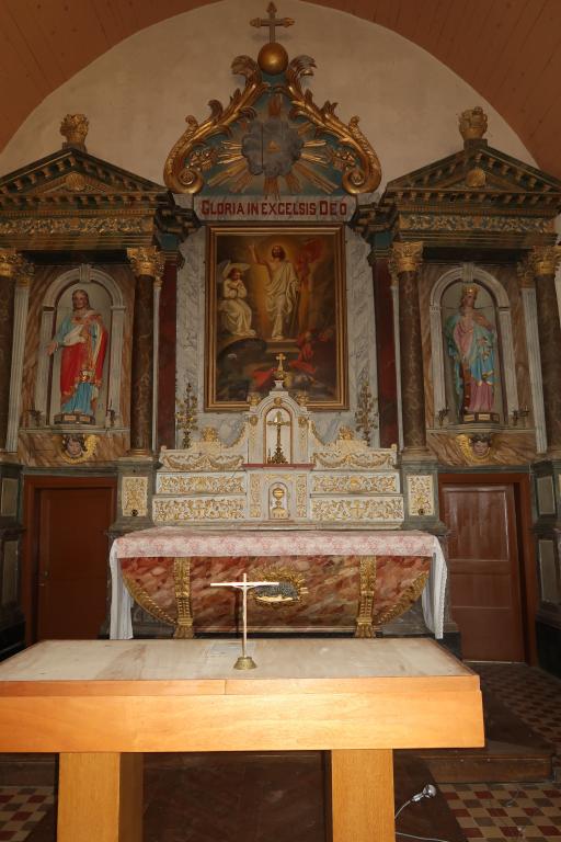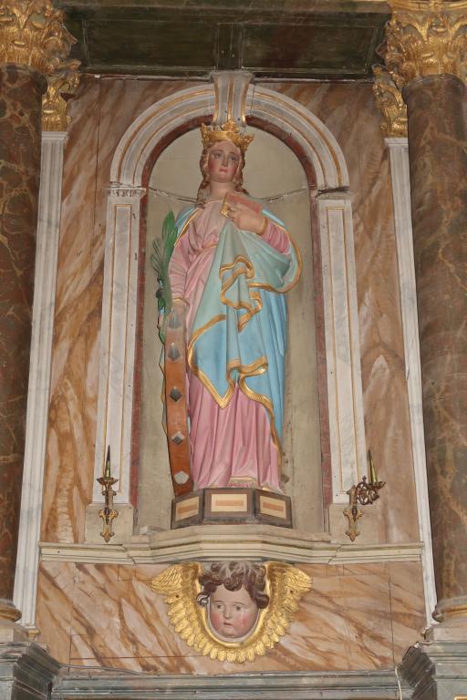 Sainte Catherine d'Alexandrie est représentée debout tenant un livre dans sa main gauche posé contre sa poitrine. A dextre, elle tient une palme tout en appuyant sa main sur une grande roue dentée disposée à côté. Elle est vêtue d'une robe ceinturée à la taille et d'un manteau retenu par deux fermaux et un ruban. Le drapé du manteau est important et se déploie autour du bras gauche. Elle porte une couronne ouverte terminée par des fleurons.