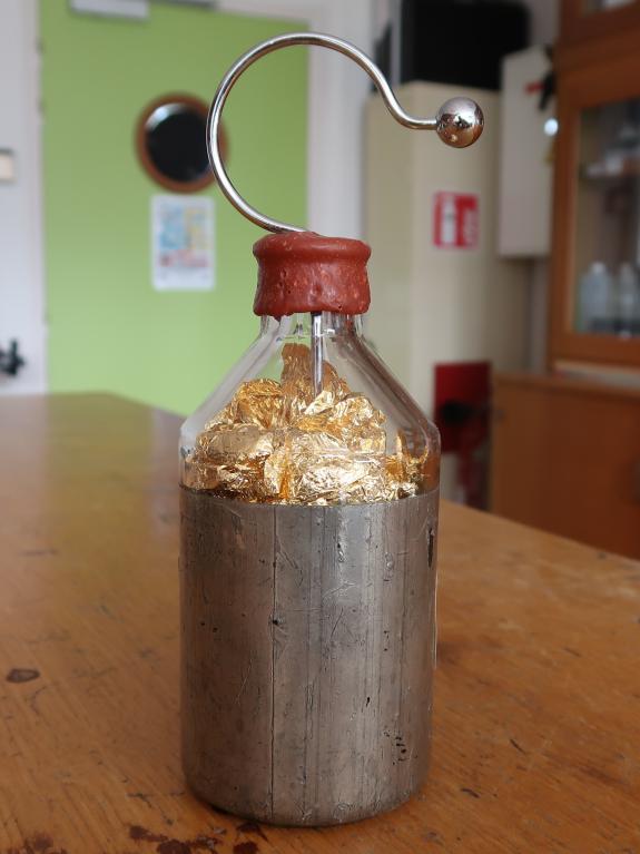 -Une bouteille de Leyde, un carillon électrique, un électroscope et une machine électrique de Wimshurst pour la discipline électricité statique.