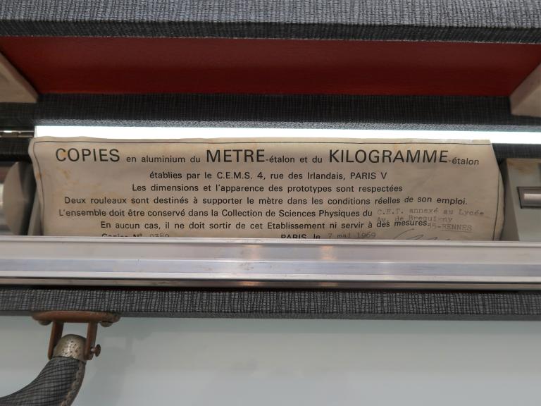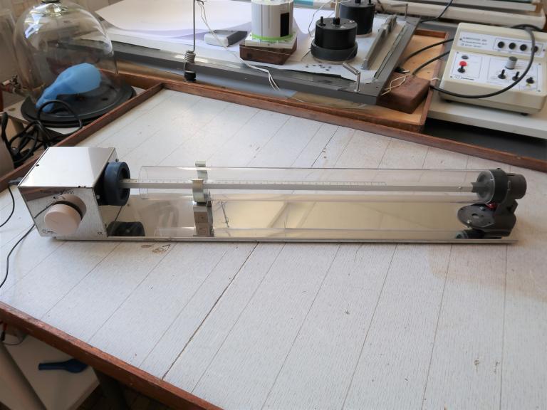 -Un appareil de chute dans un fluide et un modèle de mètre étalon à traits datant de 1969 pour la discipline pesanteur-mécanique-mesure.