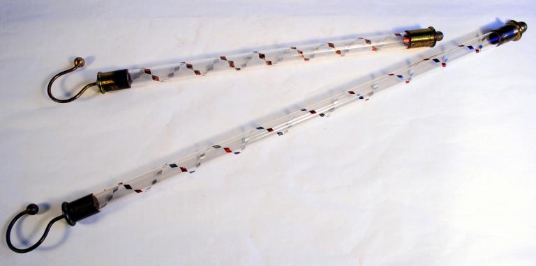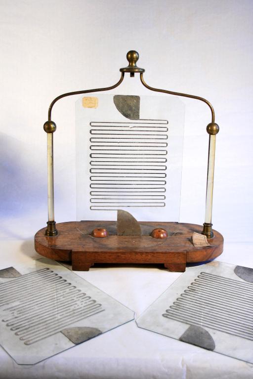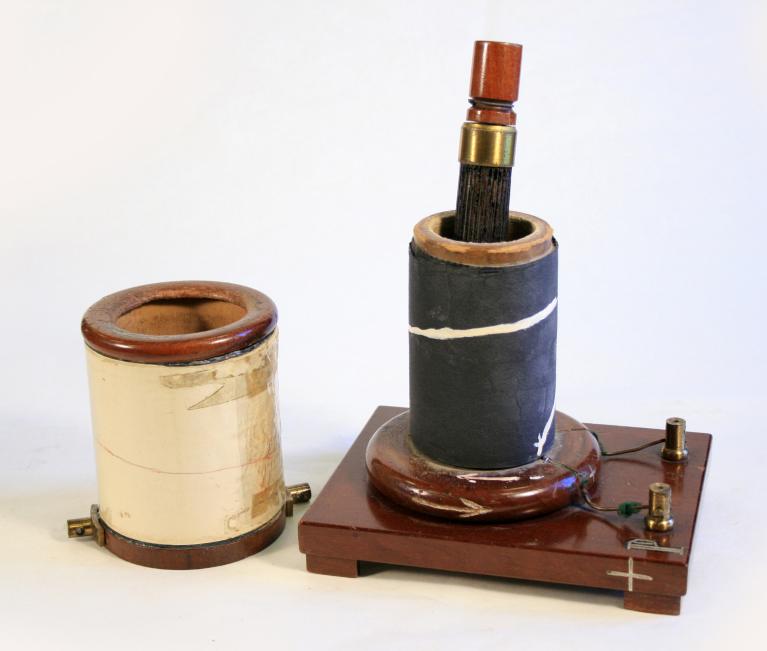 Un accumulateur au plomb Planté, divers ampèremètres (signés Sexer, A.J.C., A.O.I.P., Chauvin & Arnoux, Radiguet & Massiot, Ateliers Da et Dutilh, Morlot-Maury, Ateliers Pekly, Service standart), un appareil à chariot Dubois-Raymond, un appareil de Chassagny, deux appareils de résistances à cinq bobines (dont un signé Radiguet & Massiot et un signé Morlot-Maury), un appareil des courants parallèles, une batterie de piles de Leclanché, une bobine d’inductance variable (signée Suter), des bobines de Ruhmkorff (dont une signée Morlot-Maury), une bobine double de Faraday, une boîte à pont de Wheatstone (signée J. Carpentier), une boîte de condensateurs étalonnés (signée le matériel d’enseignement), une boîte de résistance (signée Breguet), deux boussoles-galvanomètres différentiels, un commutateur bipolaire pour deux circuits, un commutateur de Bertin (incomplet), une cuve d’Ampère à deux compartiments parallèles, un disque de Foucault (signé Radiguet & Massiot), deux échelles de vide d’après Cross, un écran platinocyanure de Baryum, un électro-aimant de Chassagnny (signé Radiguet & Massiot), un électro-aimant en U, un élément de Seebeck à une aiguille, un fil de Laplace, divers galvanomètres à cadre mobile (dont trois signés J. Carpentier et un signé A.O.I.P.), un galvanomètre de Nobili avec miroir (signé Deleuil), un galvanomètre de Thomson (signé J. Carpentier), un grand prisme de paraffine, une machine de Gramme (signé Gramme), des manipulateurs système Morse, deux maquettes de la balance de Cotton (toutes signées Matériel de laboratoire Lefebvre), un multiplicateur de Schweigger, un parafoudre à cornes, un pile de Volta, un pile de Grenet au dichromate de potassium, des piles de Leclanché, une pile de Bunsen (incomplète), un pont à fil (signé Deyrolle), des rails de Laplace, des rhéostats, des roues de Barlow, un shunt galvanomètre (signé J. Carpentier), un solénoïde à main, un solénoïde suspendu, un système de fils parallèles de Lecher, une table d’Ampère modifiée, un téléphone Bell, un téléphone Marty (modèle 1910), un transformateur de Tesla modifié (signé Ancel), un tube à vide pour les expériences de Tesla, un tube avec des minéraux phosphorescents, des tubes binaodiques à rayons X, deux tubes de Crookes à croix de Malte, un tube de Crookes avec moulinet, des tubes de Geissler (acquis en 1894), des tubes électroniques et divers voltmètres (signés Chauvin & Arnoux, J. Carpentier, Bazar électricité, Compagnie F.A.C., Morlot-Maury, Ateliers Da et Dutilh, Ateliers Pekly, A.O.I.P.).